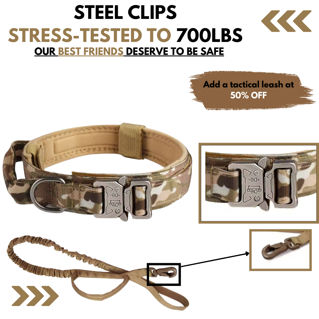 Pair your collar with our military-grade tactical no-pull harness, no-pull bungee leash and tactical mollie pouches